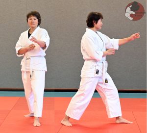 - Gyaku betekent “omgekeerd”, dat wil zeggen links-rechts, gyaku-hanmi betekent dus “in half-lichaamsstand in spiegelbeeld”